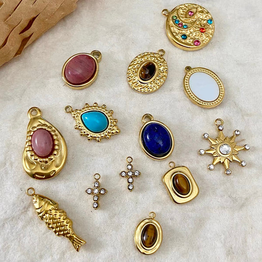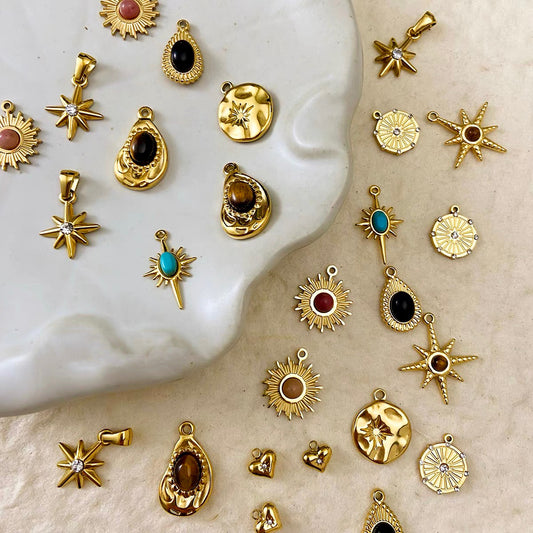 Titanium Steel Pendant Beads Plated with Real Gold and Inlaid with Natural Stones