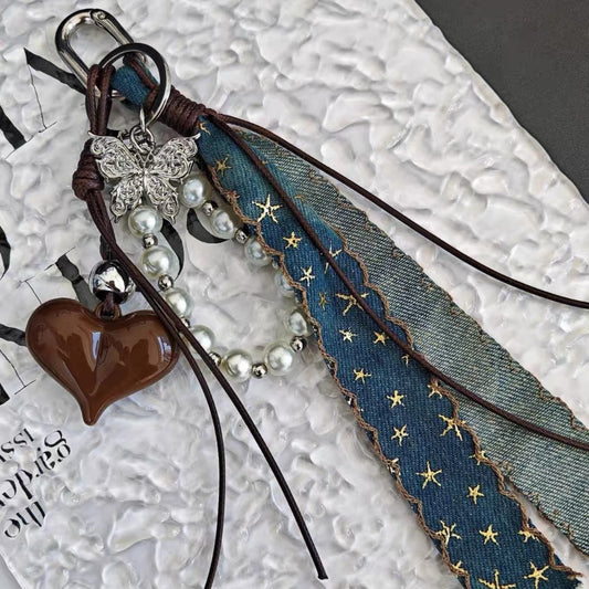 Brown Heart & Butterfly Denim Bag Charm & Phone Chain